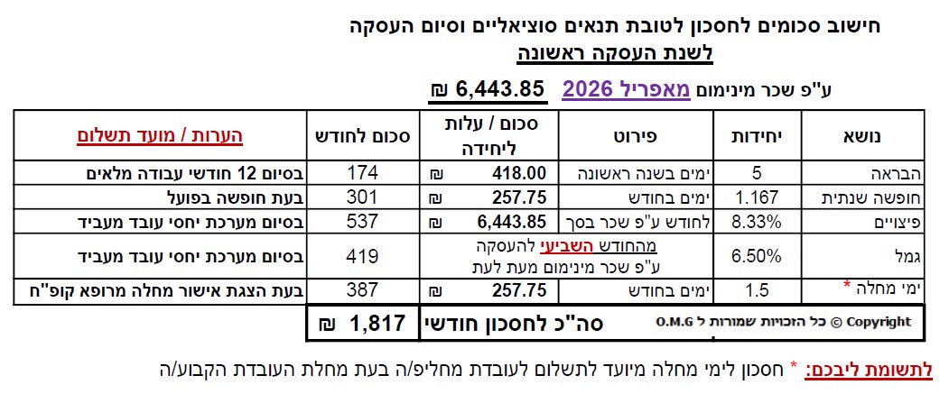 ככלל, יש לחסוך 1,800-2,000 ₪ לטובת הזכויות הסוציאליות של העובד: פיצויים, פנסיה ועוד (פירוט בטבלה המצורפת)